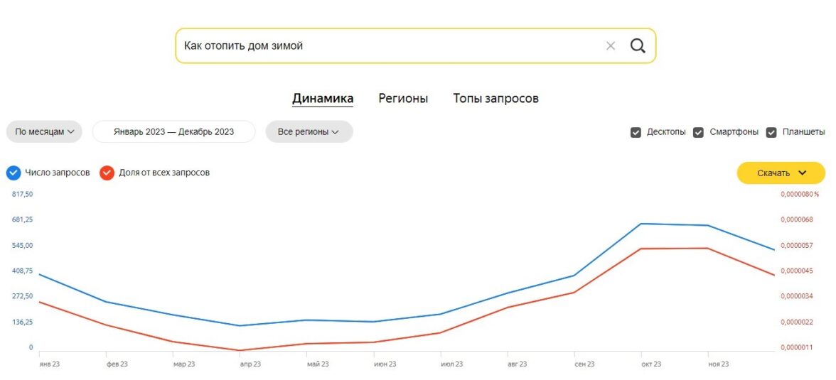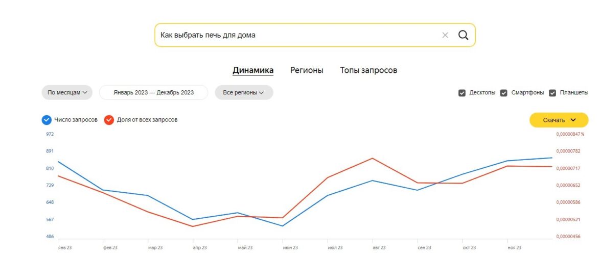 Каждый старт работ по новому проекту на платформе Дзен открывается глубокой аналитикой перспектив развития информационного блога в определенной тематике. Спрос на отопительные печи и устройства с информационным интентом обнаружили хорошим. Проверяем маркерные ключевые слова и сравниваем потенциал: