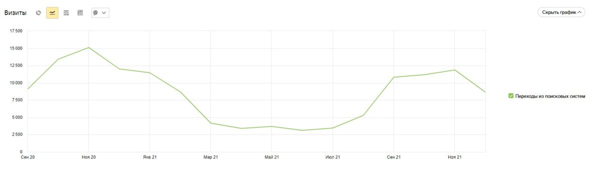 Даже слегка успели просесть по поисковику в 2021-ом, считаем, сказалось отсутствие весенне-летнего спроса на тему отопительных печей и котлов: