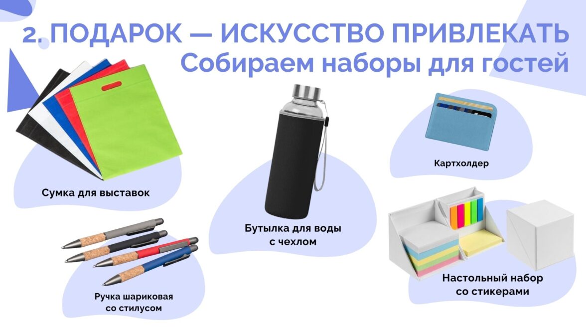 Фирменные подарки и мерч помогут вам отстроиться от других экспонентов, сделать фирменный стиль заметным и запоминающимся, и получить новых лояльных клиентов.