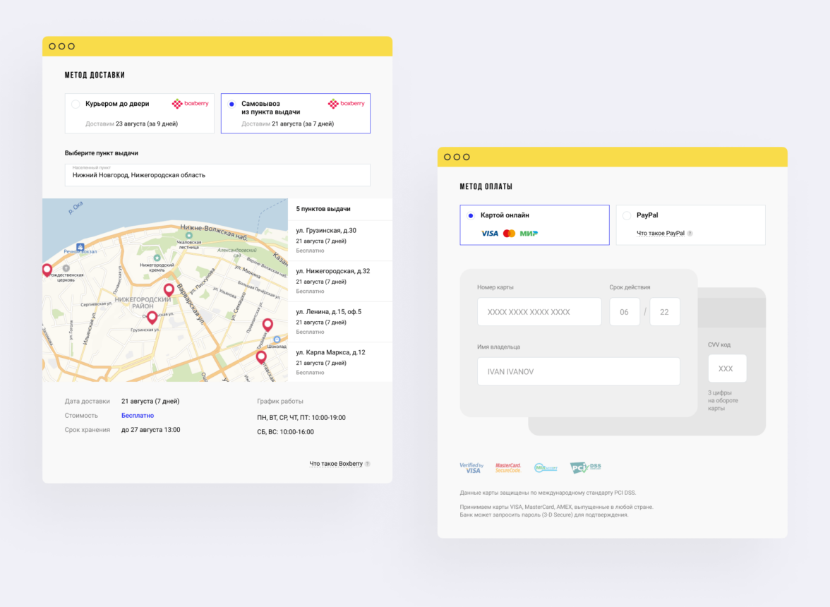 Этап оформления заказа занимал пять экранов, которые приходилось пройти, чтобы узнать точную информацию о доставке. Команда подготовила вариант обновленной корзины, которая включила в себя всю полезную информацию, вплоть до карты с пунктами выдачи. Пользователю не нужно идти на другие вкладки за информацией, но при этом блоки не перегружают страницу и остаются понятными и разделенными по смыслу.