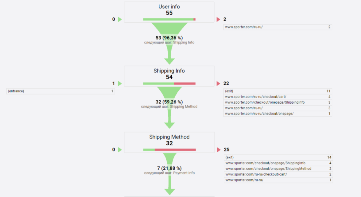 Вот пример из практики Riverstart — при исследовании воронки интернет-магазина Sporter обнаружили проблему с корзиной. Отображение слабого места на воронке: