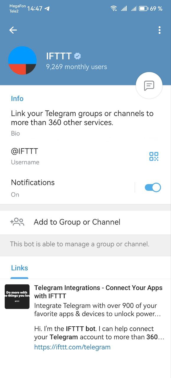 Позволяет интегрировать Telegram с множеством других платформ. С помощью IFTTT (If This Then That) можно автоматически сохранять новые фото из соцсетей в приватный Telegram-канал или получать уведомления в Telegram о важных письмах на почте.