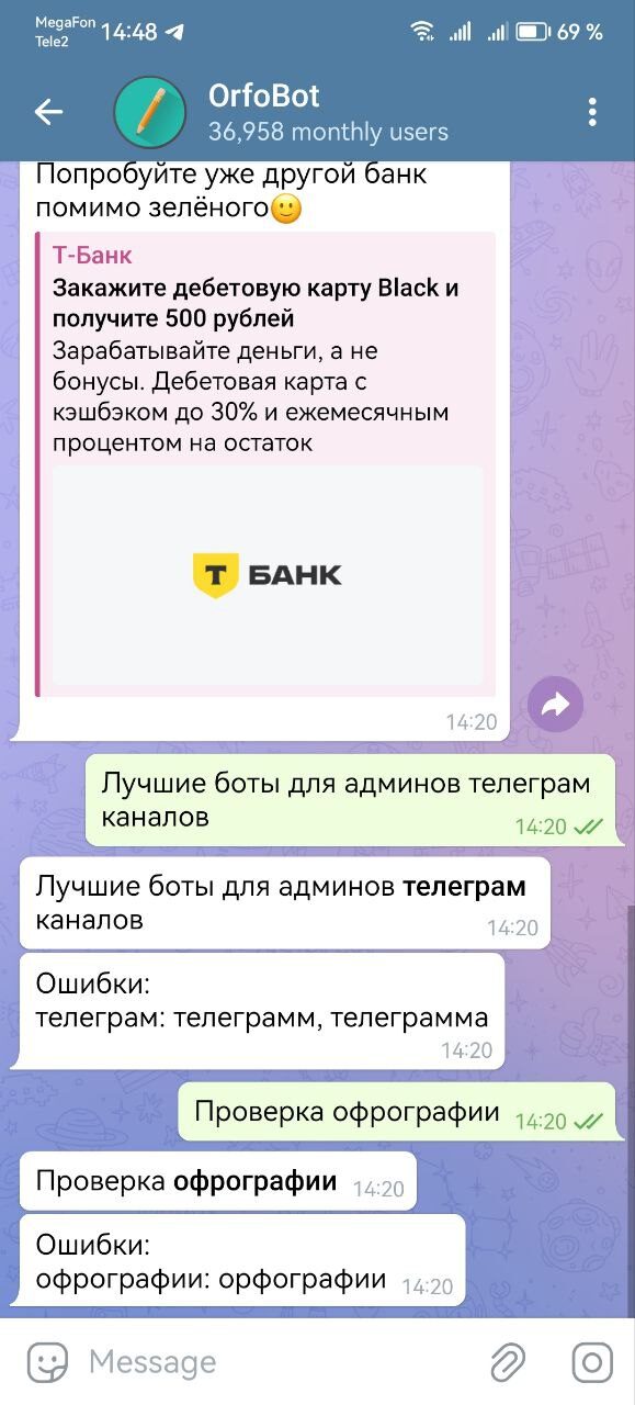 Этот бот поможет в работе с текстами: автоматически проверит орфографию и отправит текст с исправленными ошибками. Его можно использовать как в личных чатах, так и в общей беседе канала.
