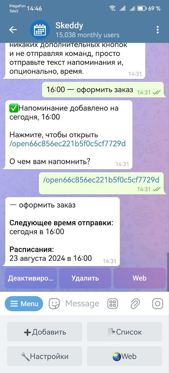 Создает простые и сложные напоминания. Вы можете отправлять команды для одноразовых или повторяющихся уведомлений в чате с ботом.