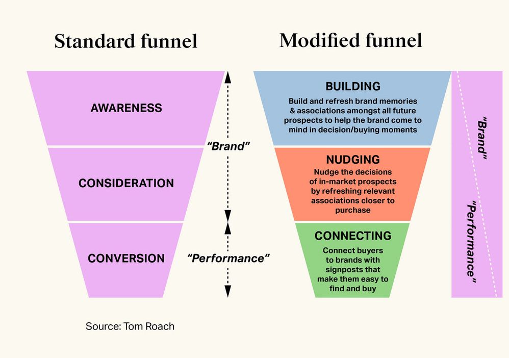 Под влиянием новых факторов WARC считает правильным переделать классическую воронку продаж — маркетинговую модель, описывающую предполагаемое путешествие будущего покупателя от первого знакомства с брендом до покупки. Раньше покупатель шел через осведомленность о существовании продукта или услуги и рассмотрение предложения бренда к конверсии. Сейчас WARC рисует путь потребителя до покупки так: