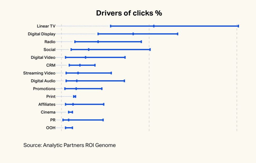 Среди самых недооцененных рекламодателями каналов, которые стимулируют рост поисковых запросов и переходы на сайты рекламодателей и маркетплейсы, WARC выделяет эфирное ТВ, баннерную рекламу, соцсети и радио. Эти медиа лучше других стимулируют рост кликов и поисковых запросов, при этом «вся слава» достается поисковой рекламе, — считают в WARC.