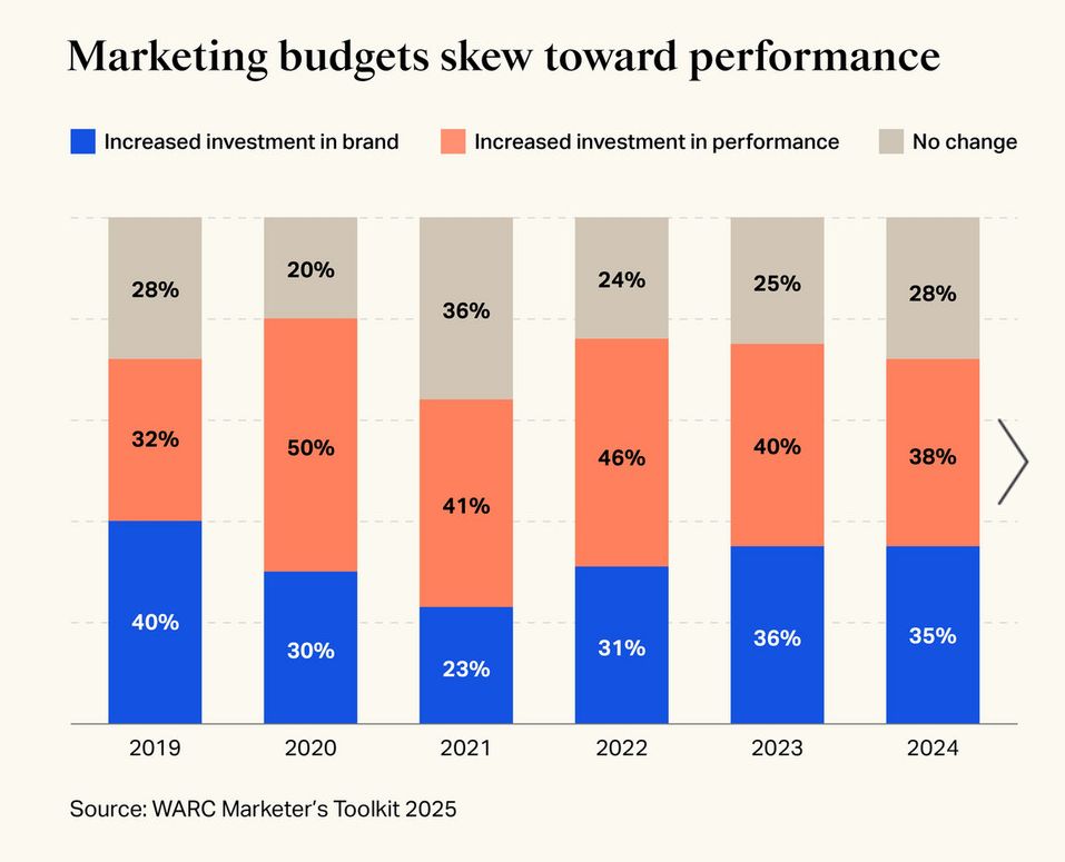 Если в 2019 году 40% опрошенных WARC маркетологов собирались увеличивать расходы на брендинг, то в 2024-м — 35%. Пять лет назад 32% рекламодателей заявляли о росте перформанс-бюджетов, в 2024-м — 38%. Опрос WARC проводил в 2024 году среди 1 тыс. представителей рекламодателей.