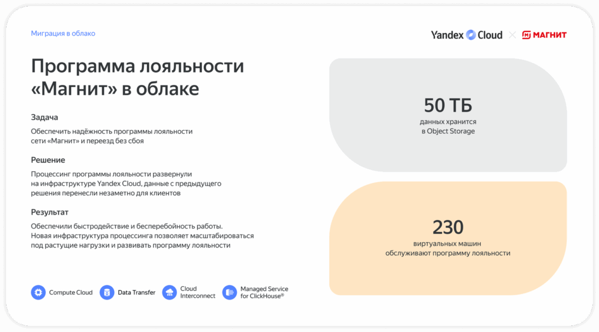 «Магниту» была нужна интеграция программы лояльности с мобильным приложением, службой доставки, кассовым ПО и корпоративным хранилищем данных. Для этого компании требовалась надёжная облачная инфраструктура. У «Магнита» уже был опыт использования инфраструктуры Yandex Cloud для других задач. Кроме того, Yandex Cloud уже обеспечивал надёжное хранение и обработку 1 ПБ данных «Магнита», поэтому выбор пал на эту облачную платформу.