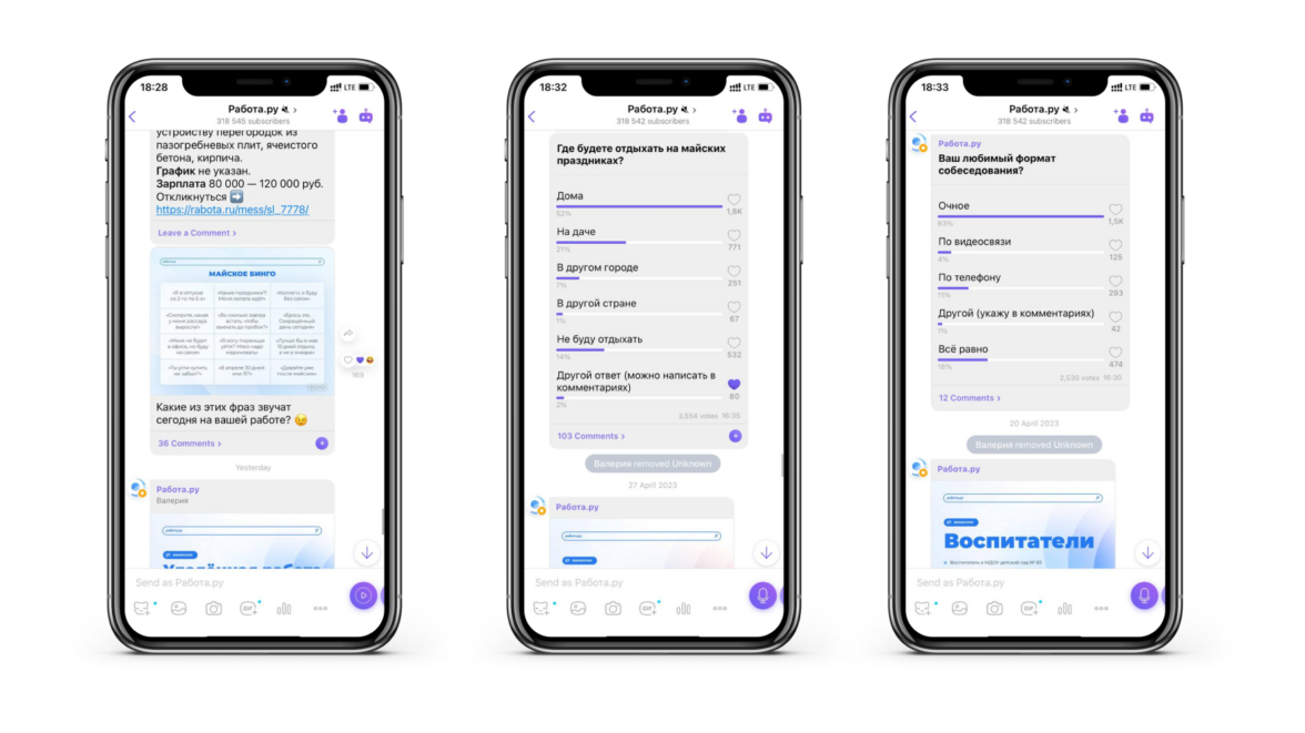 Опросы и провокационные темы для обсуждения. Мы регулярно спрашиваем мнения у подписчиков об околопродуктовых вопросах и происходящем — это помогает вовлекать аудиторию в осмысленный диалог и уточнять важные в контексте продукта вещи. Также чтобы лучше понять интересы и предпочтения наших подписчиков, мы регулярно запускаем в канале различные опросы.