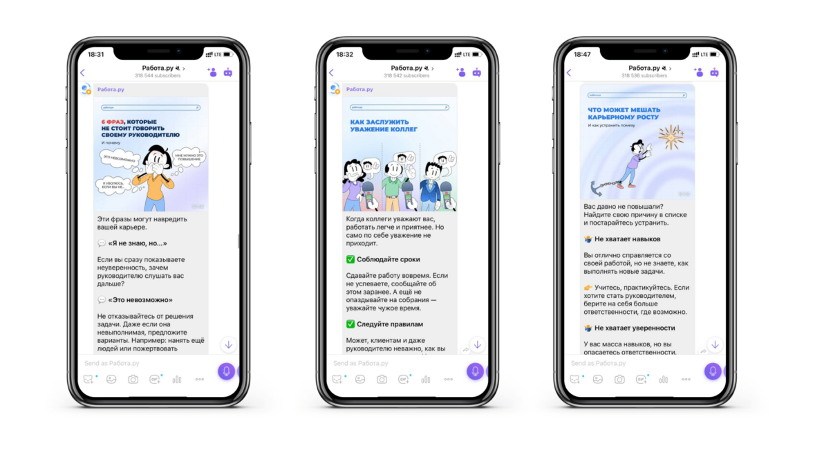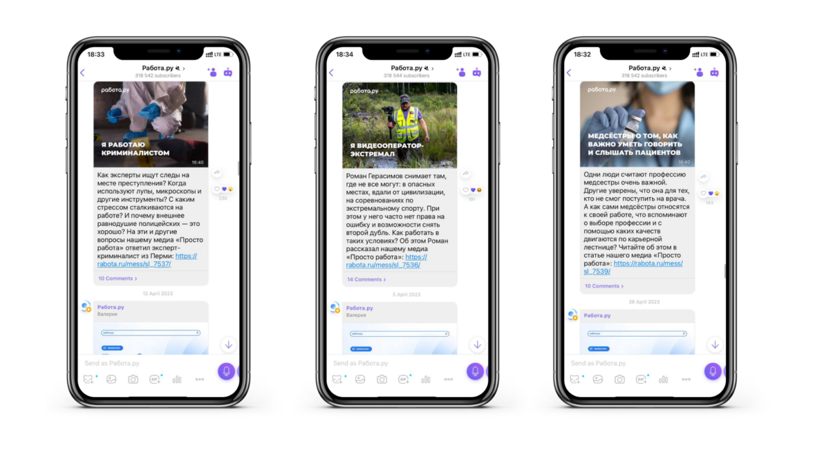 Статьи о работе из медиа «Просто работа». У «Работа.ру» есть свое бренд-медиа «Просто работа» — статьи оттуда мы «забираем» для публикации в Viber. Жизнь и статистика показали, что самые хорошие цифры получаются на интервью людей из разных профессий. Их и публикуем.