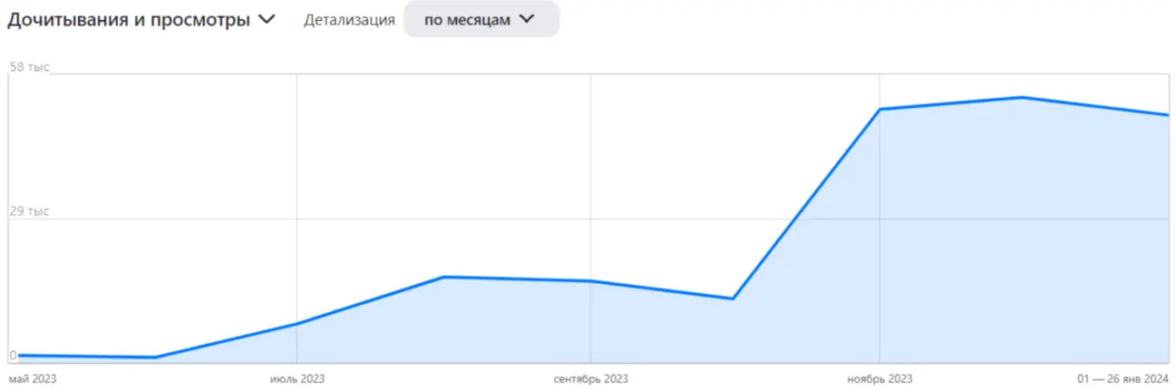 Ведём Дзен для бренд-медиа год. Полгода назад начали тестировать различные подходы к оформлению статей. По динамике видно, как отразилась смена подхода к оформлению статей на просмотрах и дочитываниях. За всё время удалось прийти от пары тысяч дочитываний в месяц к 58k дочитываний в месяц.