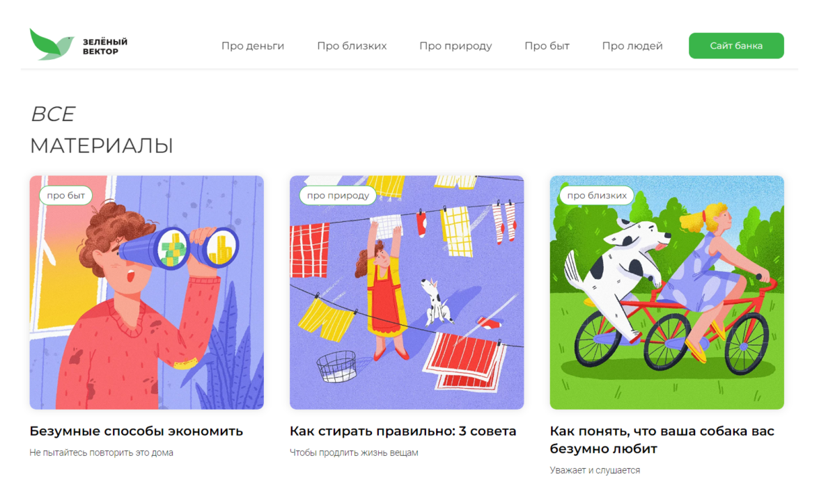 Бренд-медиа. Запустили медиа об экологичности и осознанности «Зеленый Вектор». Мы не пишем традиционные устрашающие тексты об экологических катастрофах и вине населения в них. Глобальные проблемы не интересуют нашу аудиторию. Их больше волнует решение бытовых проблем и улучшение уровня жизни. Поэтому и заходим с этой стороны: экология в отношениях с близкими и собой, обустройство быта и разумное распоряжение деньгами.