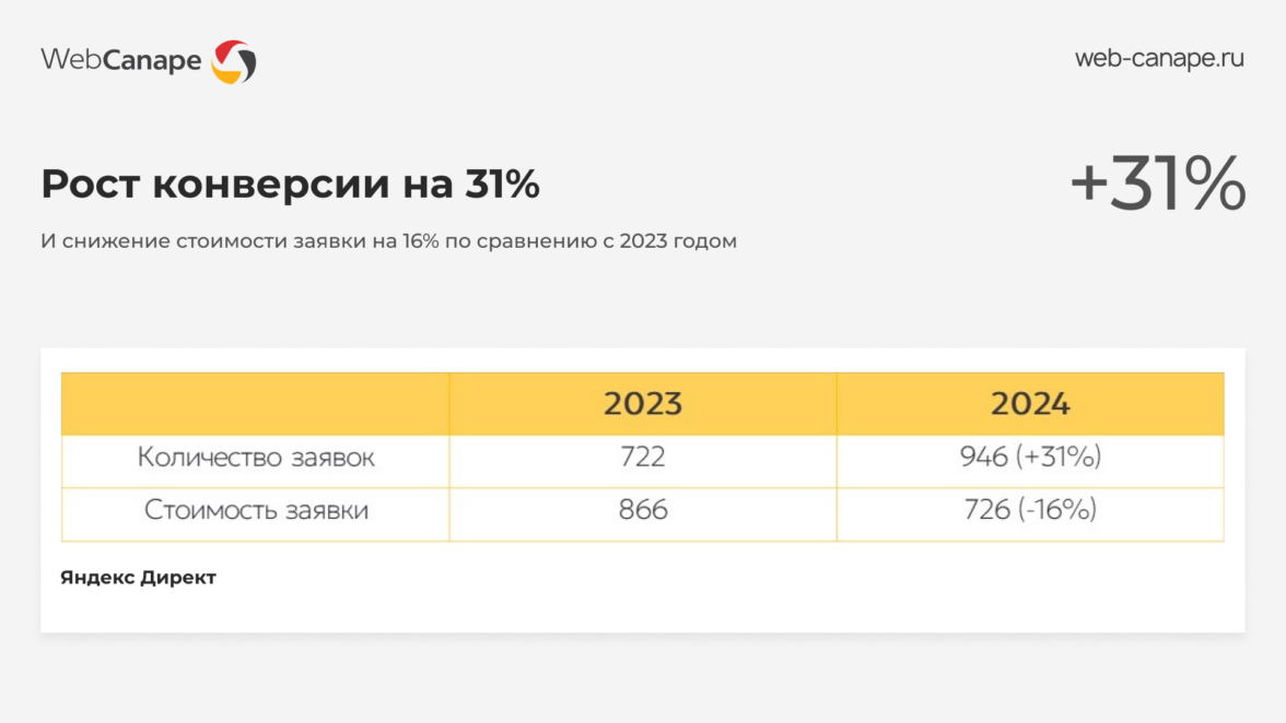 Благодаря включенности клиента мы всегда заранее знаем, какие категории товаров будут приоритетны и делаем на них упор. Совместная работа позволяет успешно масштабировать рекламу и показывать результат: рост конверсии на 31% и снижение стоимости заявки на 16% по сравнению с 2023 годом.