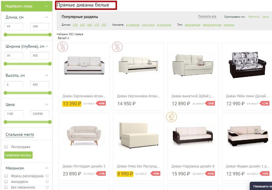 Интернет-магазинам выгодно создавать отдельные индексируемые страницы под различные результаты фильтрации товаров. Это позволит без особых затрат привлекать трафик из поиска по низкочастотникам. Причем этот трафик будет высокого качества — если человек ищет прямой белый диван, и он попадает на страницу с готовой подборкой. Это приблизит его к конверсии быстрее, чем если бы он попал на главную.