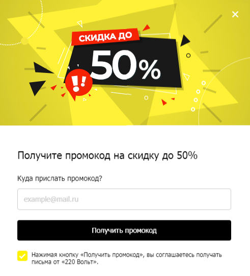 С их помощью ваше рекламное сообщение гарантированно дойдет до посетителя сайта. Для стимулирования продаж настройте всплывающее окно с акционным предложением или скидкой в обмен на e-mail. На удержание пользователей хорошо работают всплывающие окна с промокодами, которые появляются при попытке закрыть вкладку браузера.