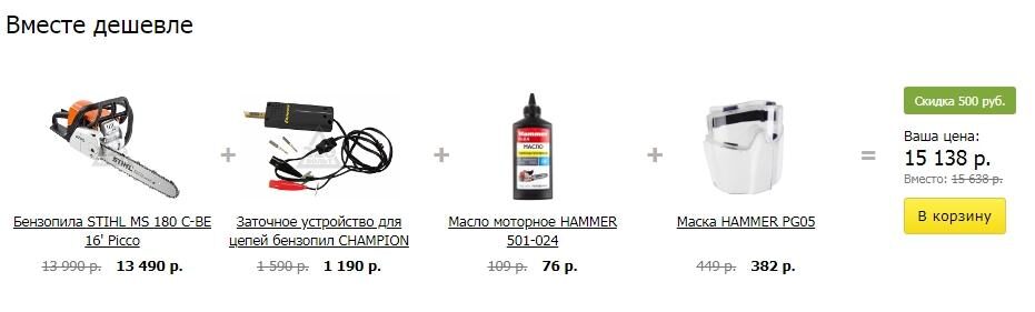 Это продвинутый вариант кросс-селлинга. Пользователю предлагаются не просто отдельные комплиментарные товары, а готовые комплекты, причем со скидкой.