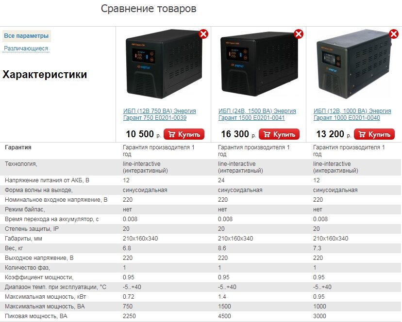 Пример сравнения товаров