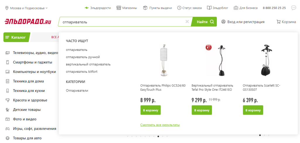 Поисковая строка в интернет-магазине — это ключевой элемент навигации. Разместите ее на видном месте — лучше в шапке сайта. Сам же поиск реализуйте таким образом, чтобы при вводе искомого товара появлялись подходящие товары/категории с ценами. Использовать дефолтный поиск от Google/Яндекса или простой поиск по семантике не стоит.