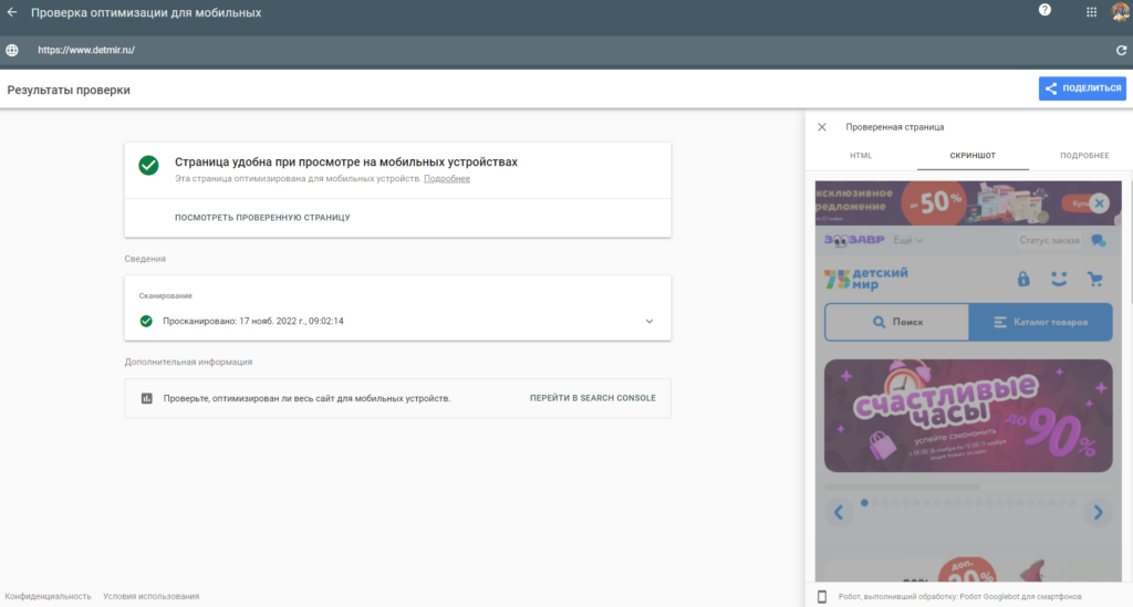 Но тест проверяет лишь технические моменты: наличие тега Viewport, отсутствие горизонтальной прокрутки, Flash-элементов и проч.