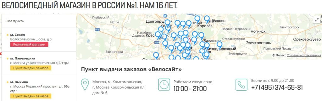 Если у вас есть свои точки выдачи, шоу-румы, торговые площадки, то обязательно добавьте карты проезда. Лучше использовать интерактивную карту от Яндекса или Google, чем статические изображения со схемой проезда.