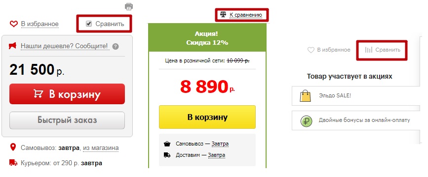 На странице сравнения возле каждого товара поместите кнопку «Купить», ссылку на исходную страницу товара и возможность удалить его из списка. Также предусмотрите фильтры: показывать все характеристики, общие и различающиеся.