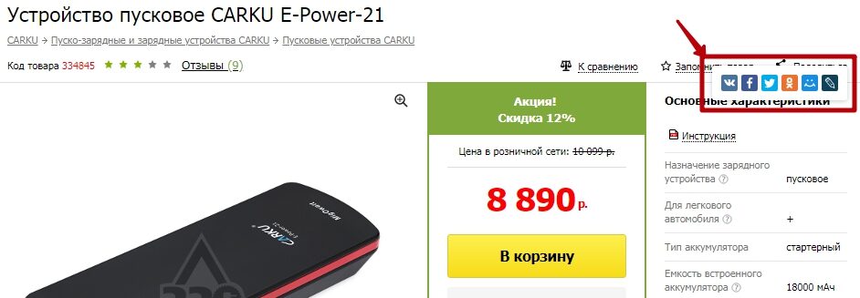 Пример кнопок соцсетей на товарной странице