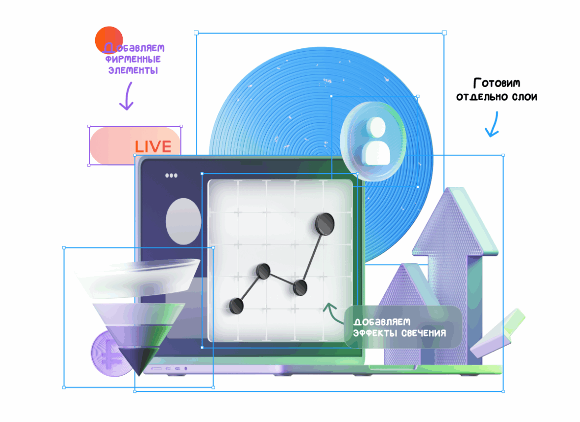 Почти готово — осталось добавить фирменные виджеты. Разрабатываем их в Фигме на основе гайдов клиента и ищем оптимальное место для них в композициях. Здесь важно избежать перегруза и сохранить баланс между объектами иллюстрации и фирменными элементами. Готовим несколько вариантов с разными расположениями виджета — на выбор клиента.