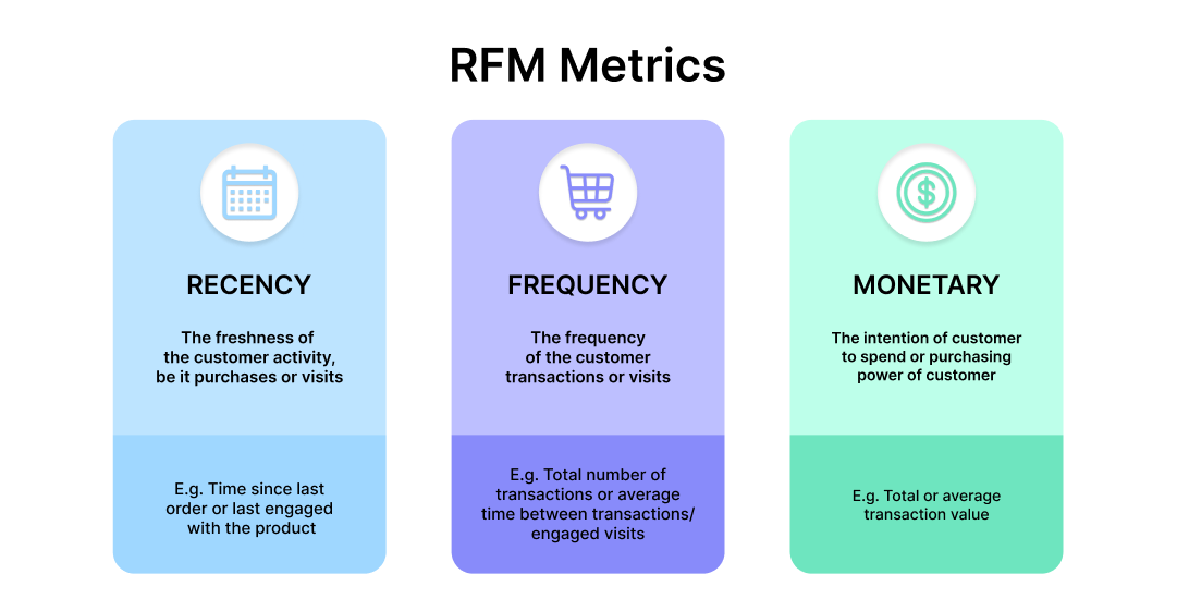 RFM-сегментация (Recency, Frequency, Monetary) — это модель разделения аудитории на группы по трём критериям: последней активности, частоте взаимодействия и окупаемости. Эта модель популярна, потому что в ней используются краткие и объективные данные. Кроме того, информацию, полученную из аналитики RFM, легче толковать. Такие показатели поведения клиентов напрямую связаны с их ценностью и вовлечённостью.