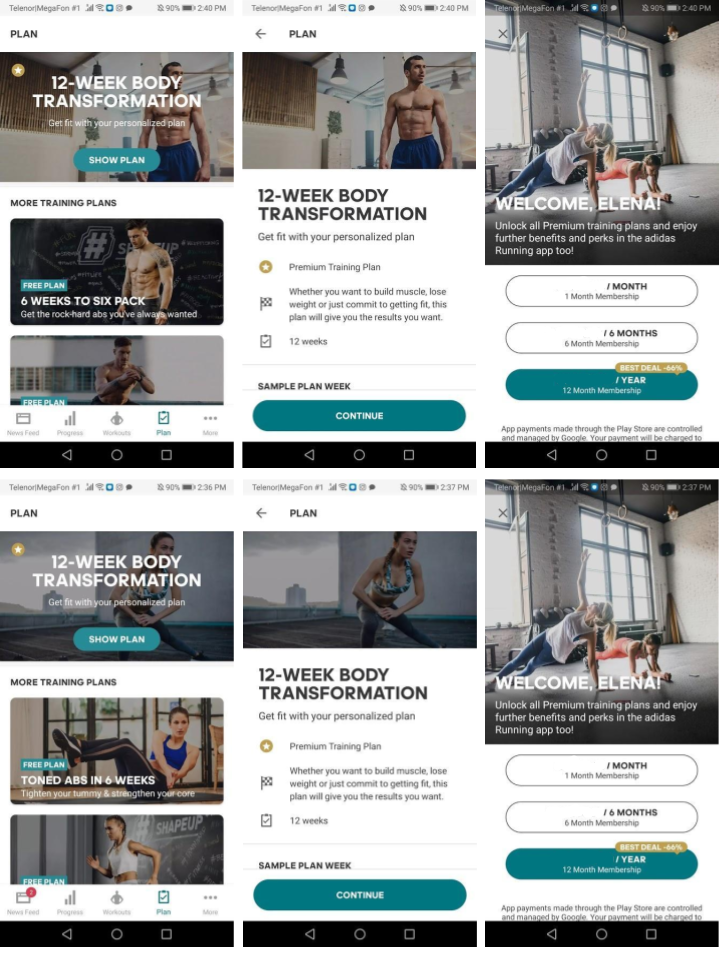 Давайте рассмотрим успешный пример из приложения Adidas Training, где в качестве признака сегментации взяли пол человека. После того как пользователь указывает свой пол в настройках, бренд рекомендует улучшенную версию сервиса. Для привлечения внимания демонстрируют спортсменок во время тренировки, чтобы предложение лучше подходило конкретной группе, и отклик стал выше.