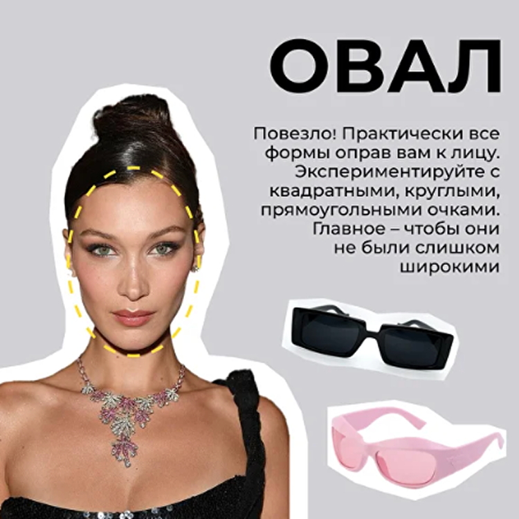 3. Выбрать аксессуары онлайн — задача не из лёгких. Часто бывает сложно представить, подойдёт ли та или иная вещь именно вам. Чтобы упростить этот процесс, мы давали аудитории рекомендации по выбору очков в зависимости от формы лица. И вместо скучных, общих советов мы использовали образы любимых селебрити в качестве наглядных примеров.