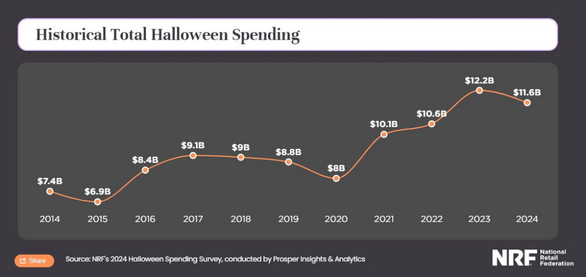 По прогнозу NFR, общие расходы жителей США на Хэллоуин достигнут $11,6 млрд долларов. Это ниже, чем в прошлом году, когда на праздник американцы израсходовали $12,2 млрд. Тем не менее, это второй по величине ежегодный показатель c 2014 года (то есть за время публикации отчетов NFR). Самым «бюджетным» был Хэллоуин 2015 года — $ 6,9 млр. В доковидную эпоху самые большие расходы на праздник были зарегистрированы в 2017 году — $9,1 млрд. Начиная с 2021 года праздничные расходы традиционно превосходят $10 млрд.