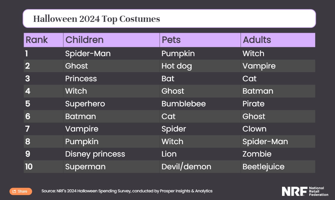 Самым популярным детским костюмом в этом году будет наряд Человека-паука. Ожидается, что так на праздник будут выглядеть 2,6 млн юных американцев. На втором месте по популярности в детском рейтинге — костюм привидения (1,8 млн). На третьем месте — наряд принцессы (1,6 млн). В первую десятку вошли также (в порядке убывания популярности): ведьма, любимый супергерой, Бэтмен, вампир, тыква, диснеевская принцесса, Супермен.