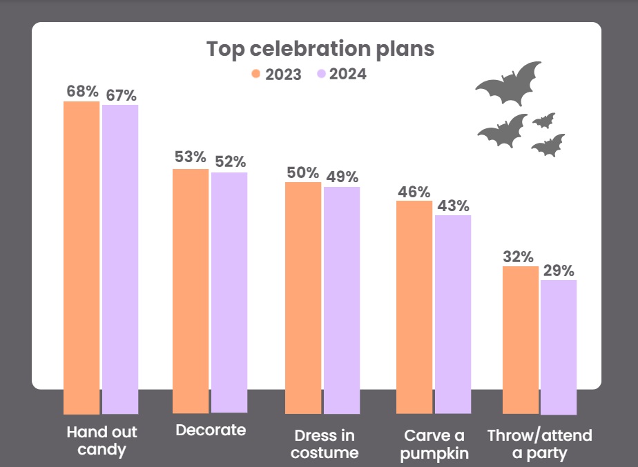 Планы американцев на праздник вполне традиционны. В соответствии с девизом Хэллоуина «сласти или страсти-мордасти» (trick or treat) на первое место выходит раздача сладостей детям. В ночь с 31 октября на 1 ноября 2024 года это планируют делать 68% американцев (год назад — 67%). Празднично украшать дом собираются 53% опрошенных (против 52% год назад). Встречать Хэллоуин в праздничном костюме хотят 50% американцев (год назад — 49%). Вырезанием тыквы думают заняться 46% опрошенных (против 43% в прошлом году). И, наконец, закатить вечеринку или сходить на вечеринку думают 32% опрошенных (против 29% в 2023 году).