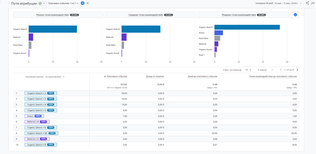Пример последовательности касаний с рекламными каналами в Google Analytics