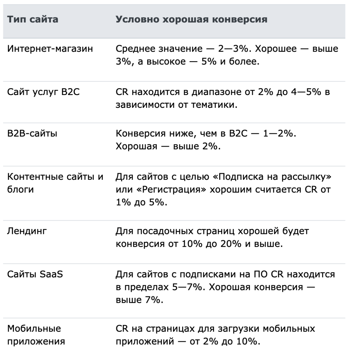 Эти цифры — примерный ориентир. Показатель хорошей конверсии для конкретного сайта зависит от разных факторов, включая конкурентную среду, аудиторию, особенности услуги или продукта.
