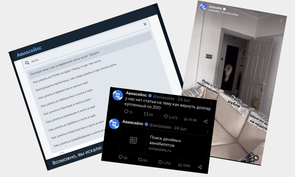 Для каждой соцсети Авиасейлс выбрал свой стиль: в Телеграм постит картинки и новости, в Х размещает остроумные твиты, а Инстаграм* полон смешных видео с котиками