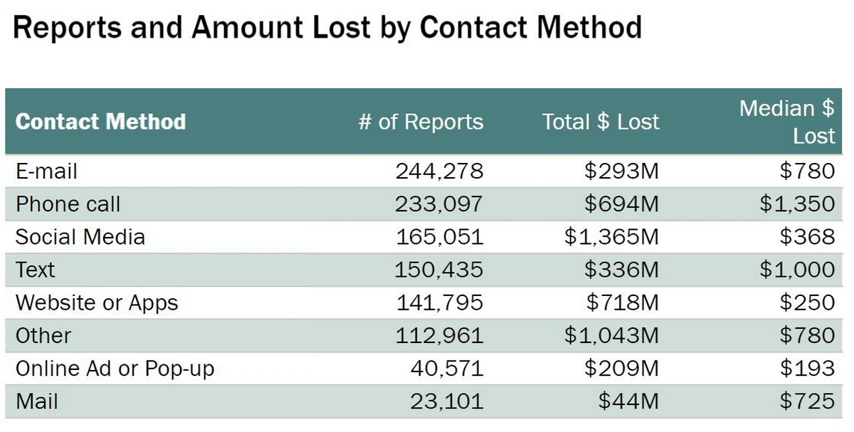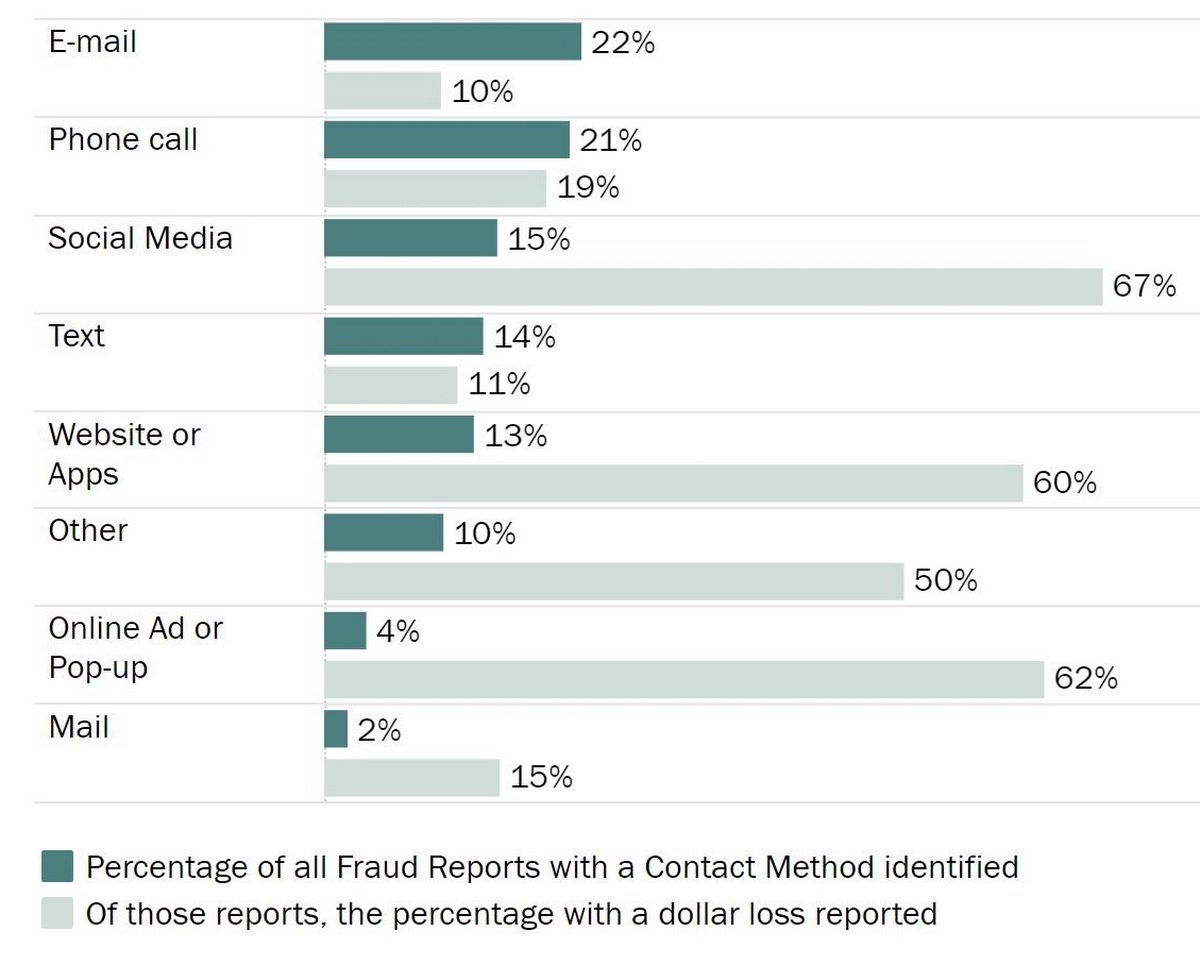 Чаще всего доверчивые американцы попадаются на уловки преступников в соцсетях: 67% случаев, когда жертва добровольно рассталась с деньгами, началась именно с общения соцмедиа. Второе и третье место заняли интернет-реклама (62%) и сайты и приложения (60%).