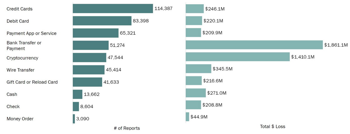 Самые массовые варианты перевода денег мошенникам – совсем не самые прибыльные для преступного мира. За 2023 год с карт или платежных сервисов американцы перевели преступникам всего $478,1 млн. Больше всего киберпреступники украли денег, используя криптовалютные кошельки и банковские переводы, где их суммарный заработок превысил $3,2 млрд.