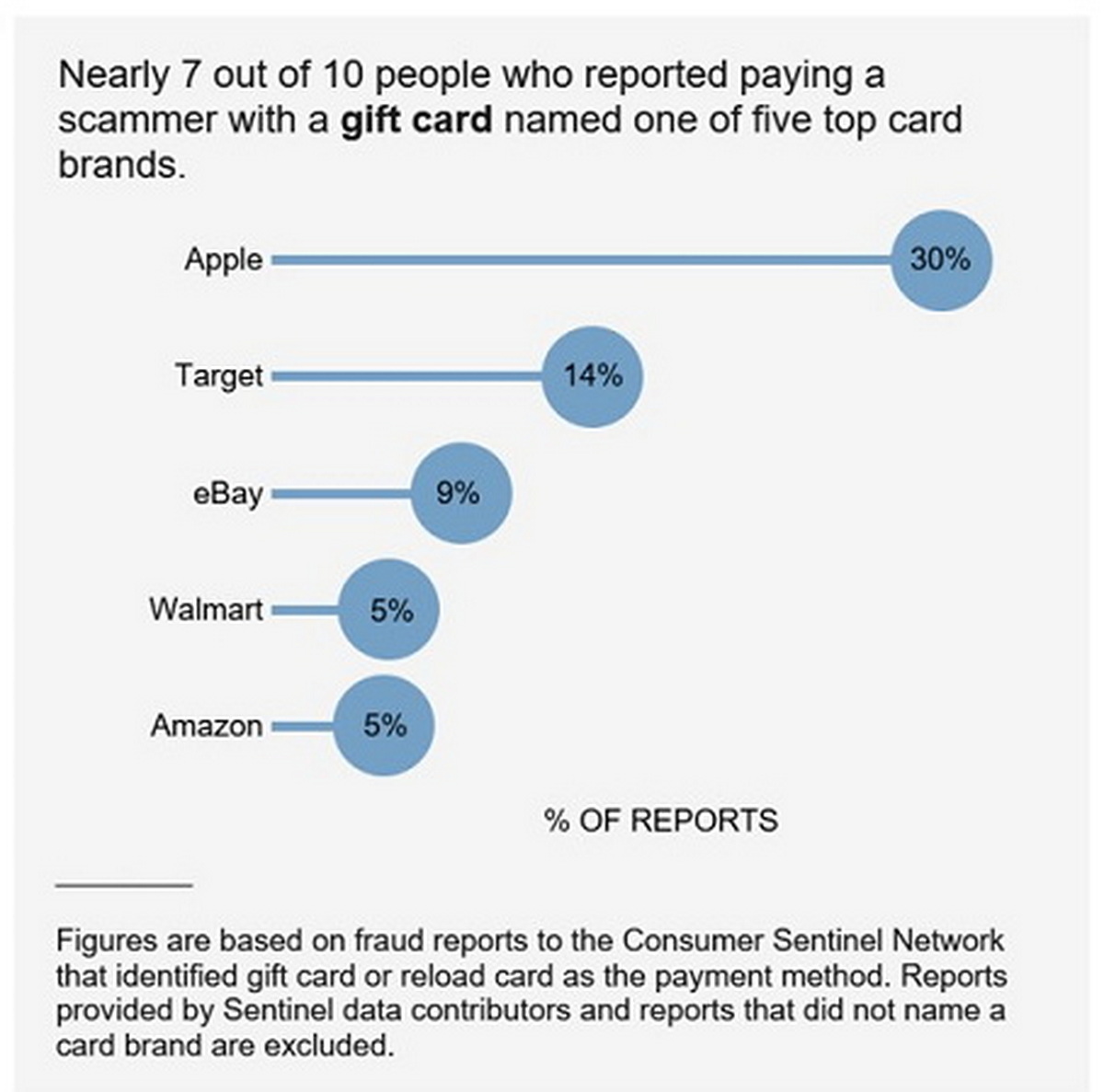 Расчеты в криптовалюте и банковские переводы, занимающие четвертое и пятое место. Они особенно популярны при совершении инвестиционного мошенничества, когда жертве предлагается очень выгодно вложить деньги и, например, поучаствовать в крайне перспективном, но малоизвестном стартапе. Еще один метод перераспределения финансовых средств – подарочные карты. В этом случае далекий и незнакомый виртуальный друг или преступник, выдающий себя за родственника, просит сделать ему подарок и прислать код подарочного сертификата какого-либо ритейлера, а, купив товар, продает его. Самые популярные у мошенников подарочные карты – Apple, Target, eBay, Walmart и Amazon.