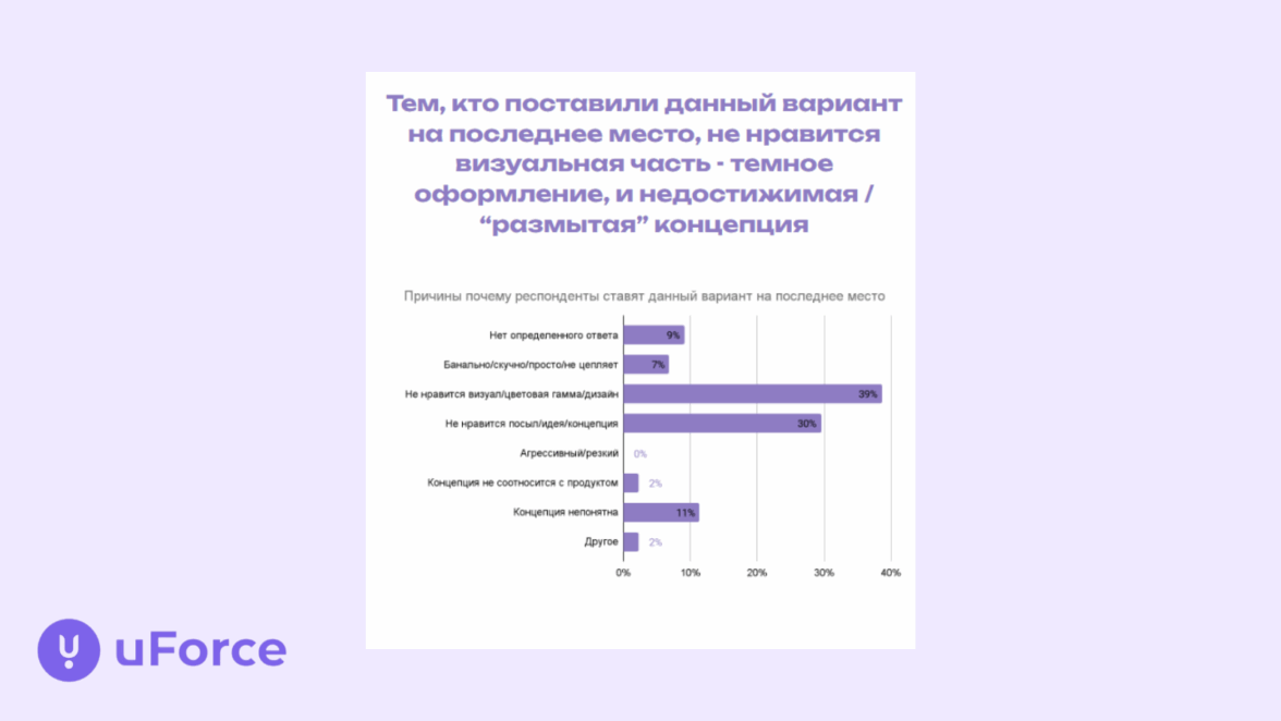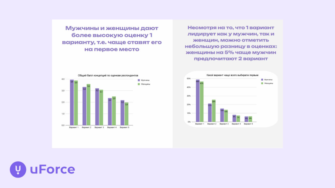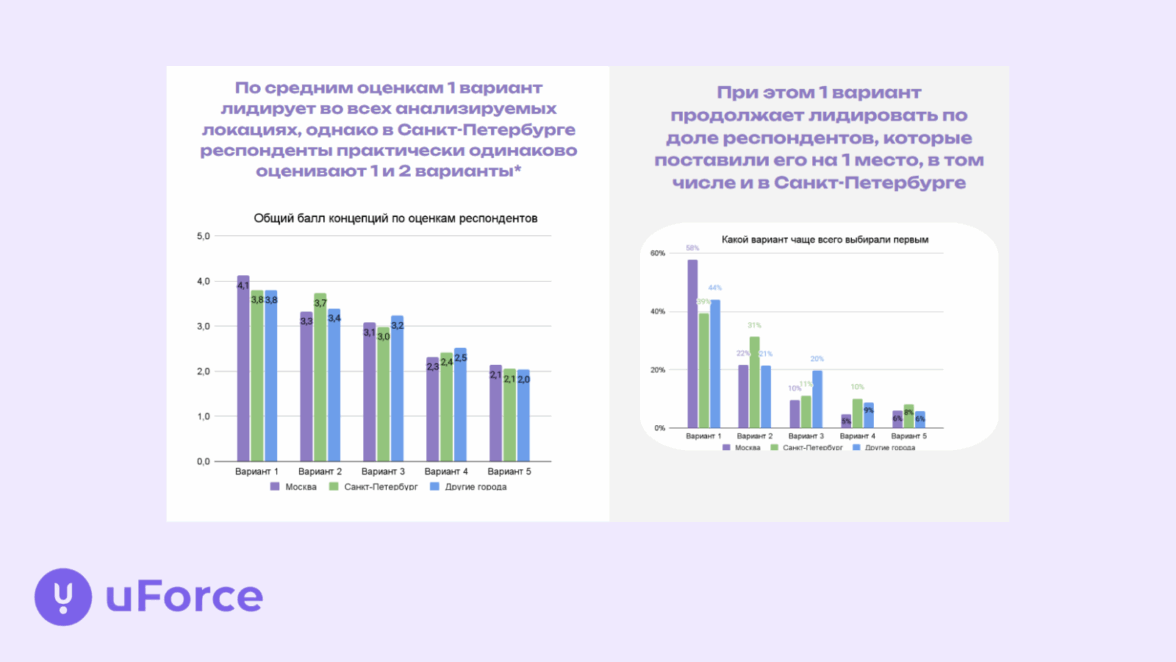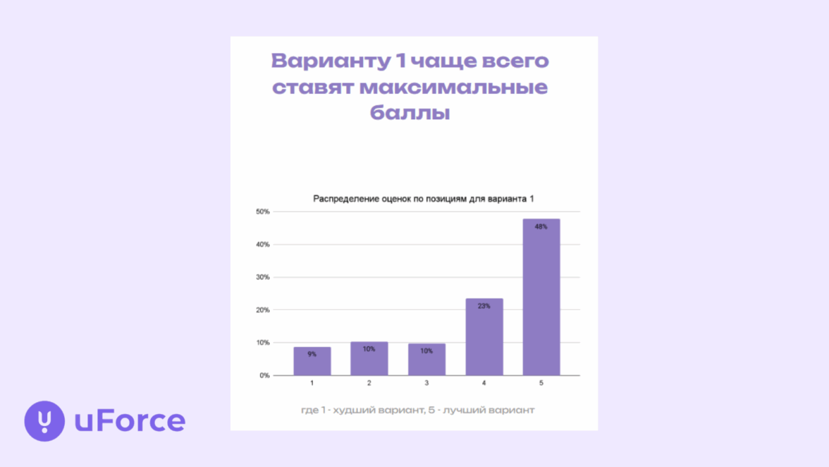 В конце мы подготовили презентацию с визуализацией результатов. Показали, как распределялись оценки, какой макет лидировал, какие были отклонения по аудитории. Это позволило заказчику быстро принять решение по дальнейшему развитию продукта на основе мнения сотен молодых людей без траты времени на кропотливую работу с данными.