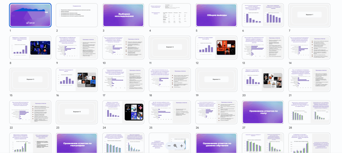 Когда все данные были собраны, мы проанализировали их. Определили, какой макет оказался самым популярным, а какой — наименее. Посмотрели различия по полу, возрасту и городам. В отчете привели средние оценки, распределение предпочтений и примеры цитат респондентов, чтобы было понятно, почему студенты выбирали тот или иной вариант.