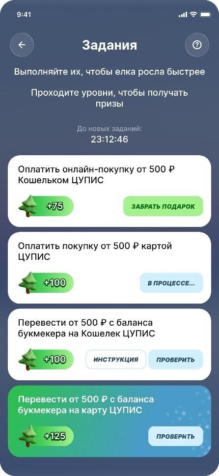 Что сделали во втором запуске. Сократили список до 4 заданий. Все — на самые популярные сценарии использования приложения: оплатить покупку, перевести с баланса букмекера на кошелек, перевести на карту. Простые, понятные действия, которые пользователь и так совершает.Задания стали ежедневными. Выполнил — вернулся — забрал награду — на следующий день снова доступно.