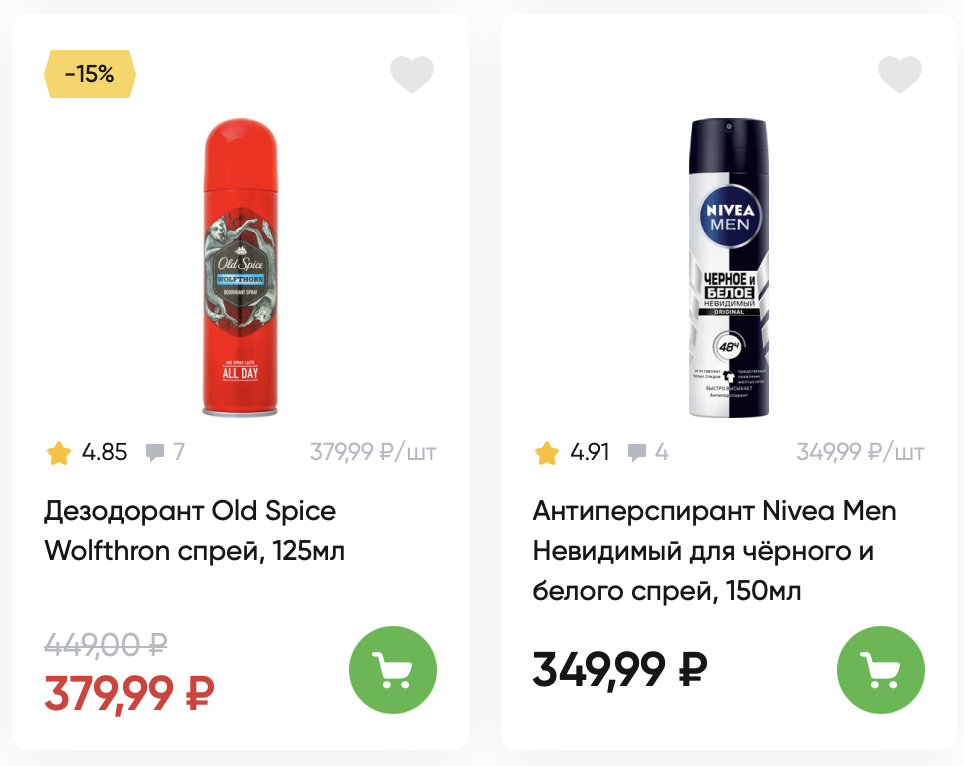 Два товара одной категории рядом — первый чуть дороже, но подкупает скидка