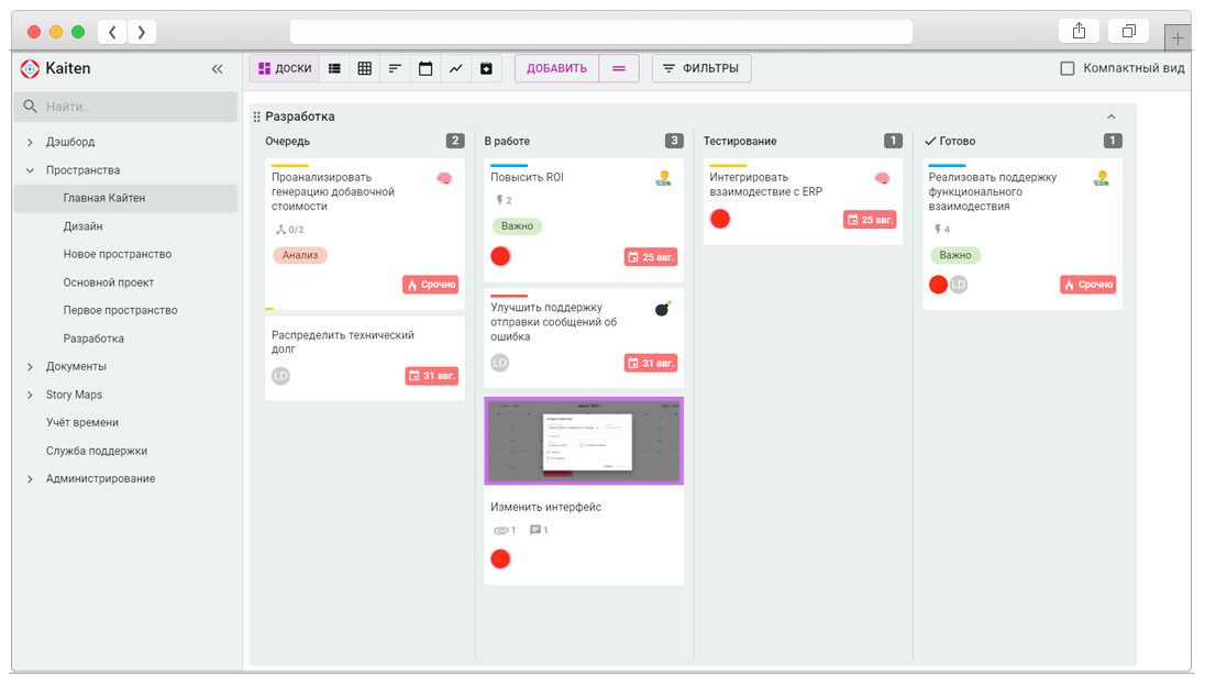 С ростом команды и количества проектов растут операционные издержки на координацию, повышаются риски срыва сроков и потери информации, что напрямую влияет на результативность команды. Kaiten — это гибкая платформа для управления рабочими процессами, которая позволяет систематизировать планирование, постановку задач, контроль их выполнения и коммуникацию внутри команды. Сервис поддерживает различные методологии и предоставляет единое пространство для работы.