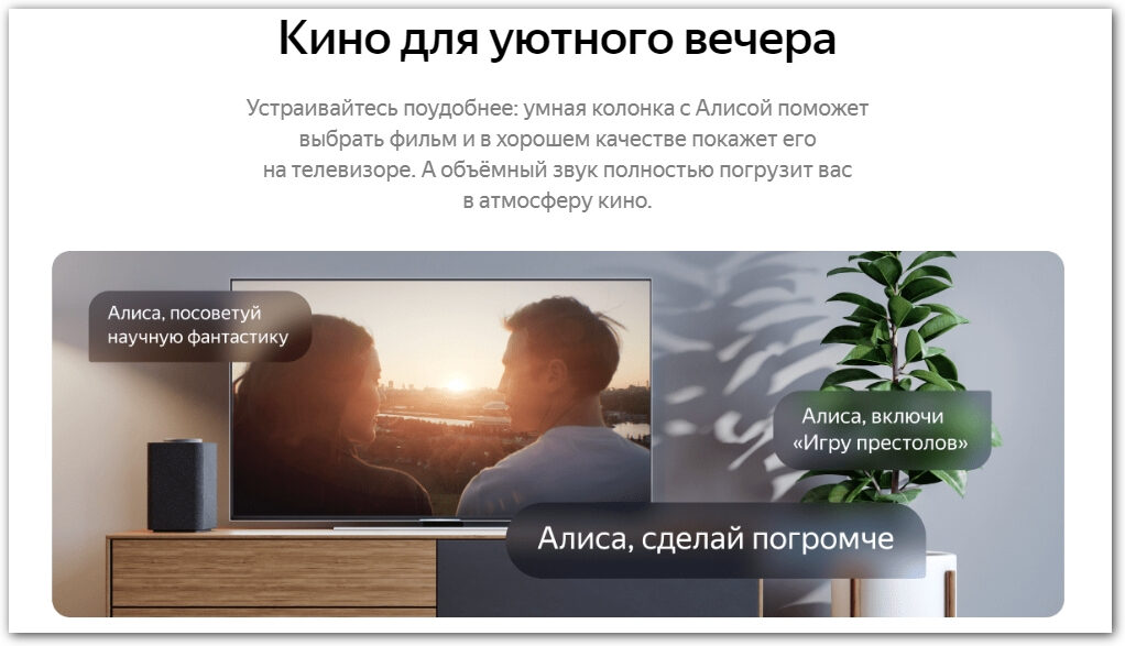 Или, допустим, вы пишете текст про умную колонку. Возьмите фото колонки в домашней обстановке и покажите команды, которые упростят жизнь покупателя. Вот как это сделали в Яндексе: