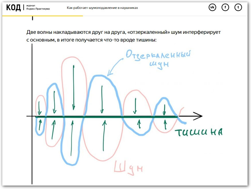 А вот как в статье журнала «Код» объясняют принцип действия шумоподавления в наушниках. Сначала описывают суть текстом, а потом наглядно показывают, как это работает