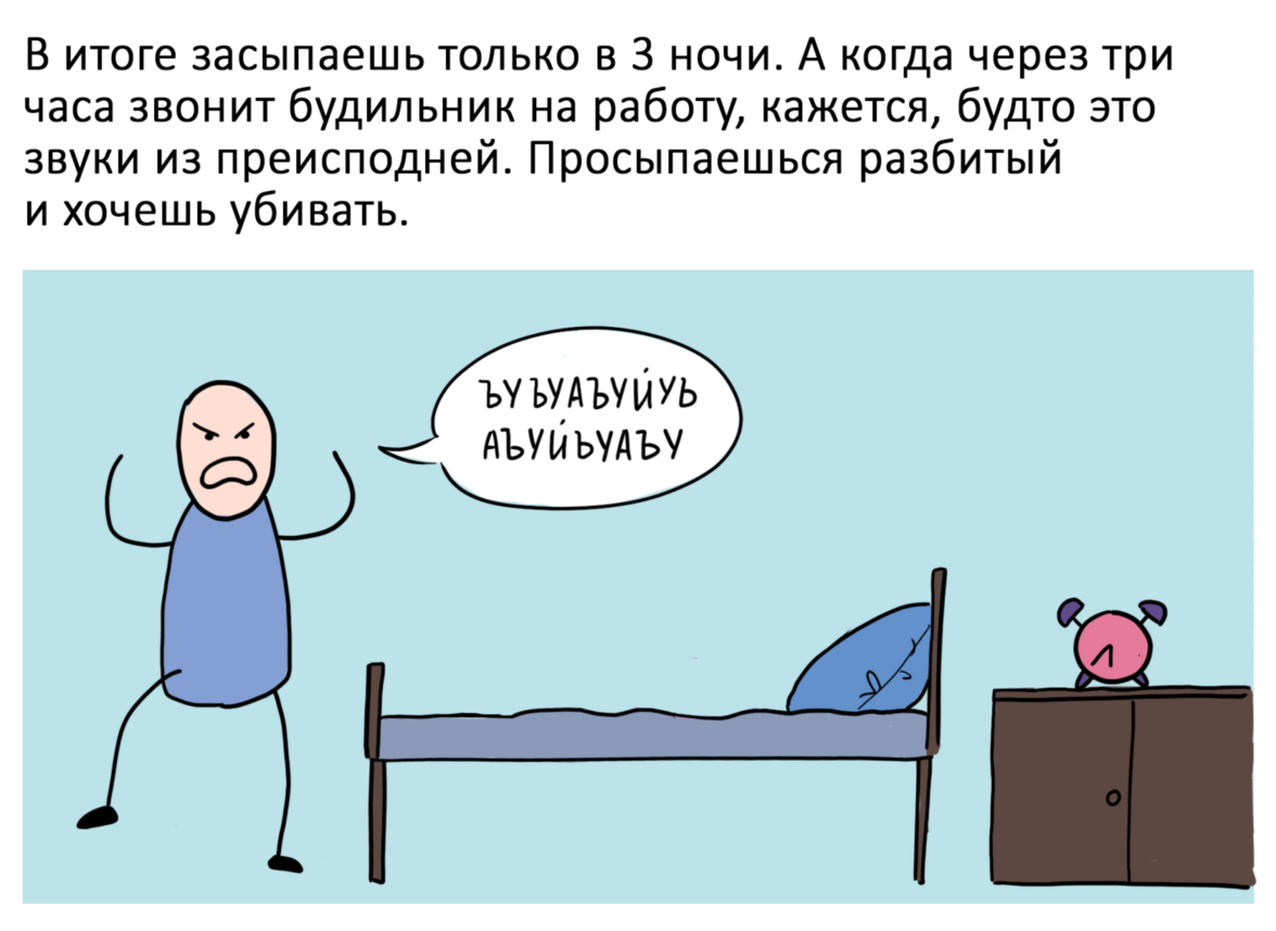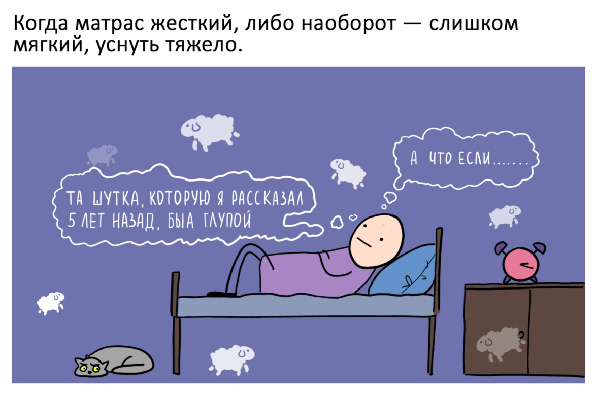 Допустим, вы пишете рекламную статью про дорогие матрасы и целый раздел посвящаете проблеме — на неудобном матрасе человек долго не может расслабиться и уснуть. Чтобы развлечь читателя, добавляете кучу иллюстраций, которые вроде как «жиза» и давят на больное. Получается что-то такое: