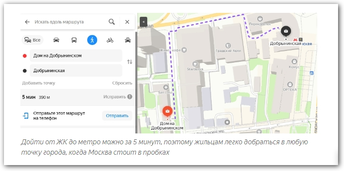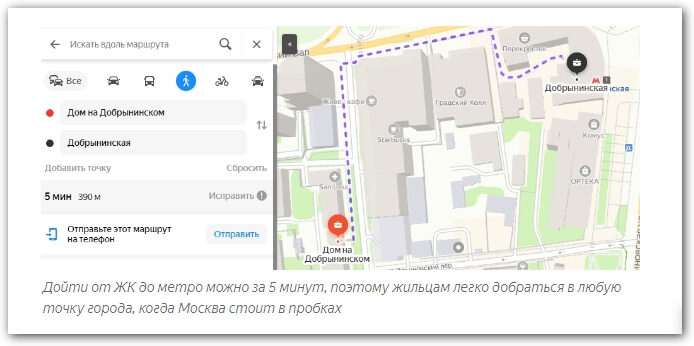 То же самое и с другими продуктами. Например, вы пишете статью о новом ЖК недалеко от центра Москвы. Покажите читателю преимущества жизни в нем с помощью фото. Как вариант: можно зайти в Яндекс. Карты и сделать скриншоты панорам ближайших достопримечательностей. Или построить маршрут и показать на карте, что до метро и правда идти 15 минут.