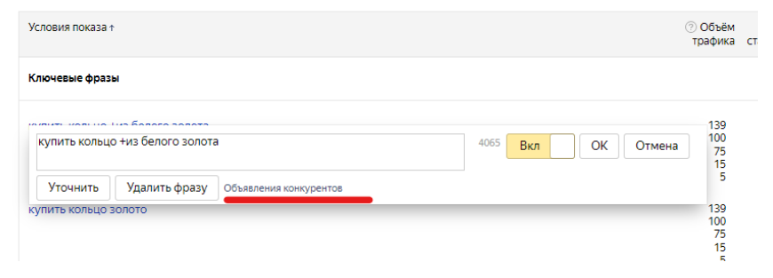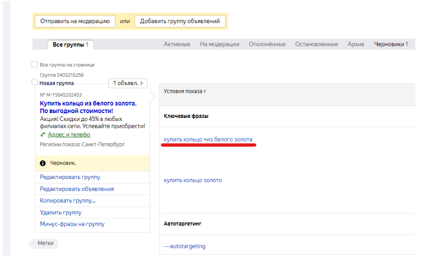 Вы увидите объявления и ключевые фразы. Нажмите на фразу, по которой вам нужно посмотреть объявления.