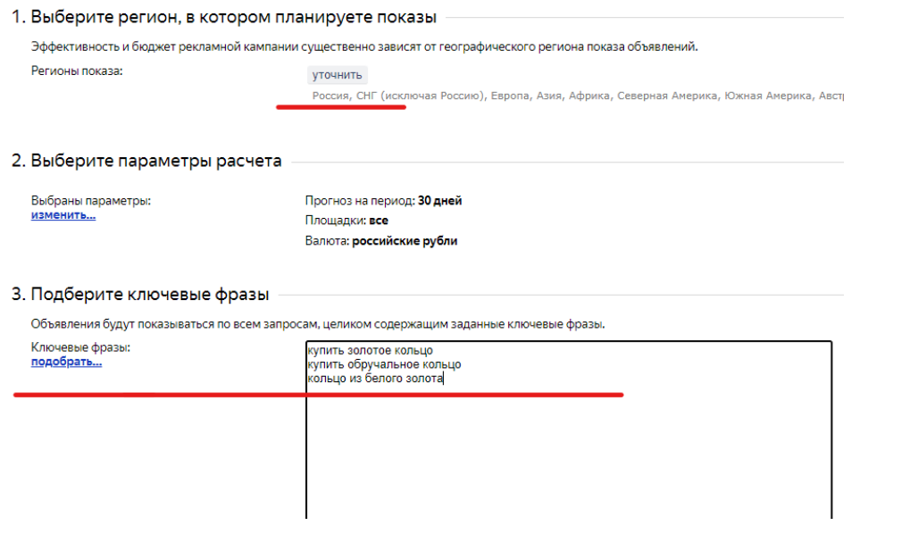 Затем выберите регион показа рекламы, добавьте семантику в соответствующее окно и нажмите «Посчитать»: